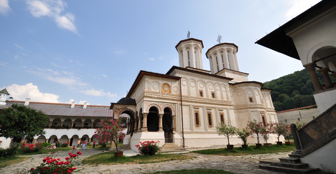 Construită între 1690 și 1693 pe un plan trilobat, biserica Sfinții Împărați Constantin și mama sa Elena dezvoltă modelul Bisericii episcopale a Mănăstirii Curtea de Argeș în sensul unor forme mai elansate și prin adăugarea unui pridvor tipic stilului brâncovenesc, cu arcade susținute de zece coloane de piatră, împodobite cu ornamente tipice Renașterii târzii. Fațadele sunt decorate cu panouri dreptunghiulare și firide ornamentale cu cercuri. Ancadramentul ușii de intrare este din marmură sculptată, pisania conține stema Țării Românești și pe cea a familiei Cantacuzino. Drept constructori ai edificiului sunt menționați Manea, „vătaf al zidarilor“, Istrate lemnarul și Vucașin Caragea pietrarul.